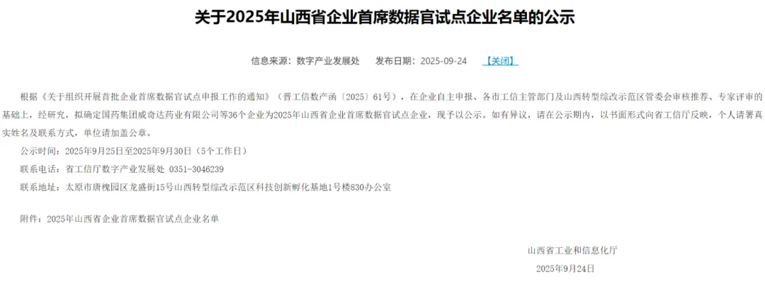 近日,山西省工业和信息化厅发布2025年企业首席数据官试点企业名单,清众科技凭借在数据治理、数字化转型领域的突出表现与前瞻布局,成功入选。